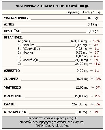 Πιο συγκεκριμένα, το πεπόνι αποδίδει μόνο 34 θερμίδες/100 gr., 8,16 gr. υδατάνθρακες και 90gr. νερό. Δε θα πρέπει να ξεγελάει η ελαφριά του γεύση αφού έχει αρκετή φυσική ζάχαρη και έτσι η υπερκατανάλωσή του μπορεί να είναι επιβαρυντική για το βάρος μας. Η χημική του ανάλυση έχει δείξει ότι είναι πλούσιο σε βιταμίνες Α και, C, καθώς και σε θειαμίνη, νιασίνη, Β6 και κάλιο ενώ δεν περιέχει καθόλου χοληστερόλη. Καλό θα είναι να τρώγεται ώριμο, διαφορετικά παρέχει ελάχιστα από τα παραπάνω διατροφικά στοιχεία, που αναλύονται στον πίνακα. Όσο πιο ώριμο είναι το πεπόνι τόσο μεγαλύτερα ποσοστά β-καροτίνης περιέχει. Χαρακτηριστικό δείγμα της ωριμότητάς του είναι το άρωμά του. Επομένως, διαλέγετε πεπόνια που έχουν ικανοποιητικό βάρος και είναι αρωματικά (γλυκιά οσμή). Διαφορετικά τοποθετήστε το για μερικές μέρες σε θερμοκρασία δωματίου μέχρι να αποκτήσει το άρωμά του και μετά κόψτε το.