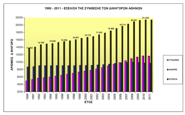 Το 1990 ο δικηγορικός σύλλογος Αθηνών αριθμούσε 13.692 δικηγόρους και το 2012 21.776. Είχαμε λοιπόν μέσα σε 22 χρόνια σχεδόν διπλασιασμό των δικηγόρων. Το 2010 7015 δικηγόροι δεν έκαναν ούτε μια παράσταση, ενώ 9660 δικηγόροι δεν είχαν ούτε ένα συμβόλαιο. To 2011 η κατάσταση επιδεινώθηκε περαιτέρω καθώς ο αριθμός των δικηγόρων χωρίς παράσταση σε υπογραφή συμβολαίου αυξήθηκε κατά 2467 φθάνοντας στις 12127. 5636 είχαν 1 με 2 παραστάσεις και 2864 3-5. Να τονίσουμε ότι η κατάσταση έχει επιδεινωθεί περαιτέρω. Στην ουσία ένα 10-20% των δικηγόρων στο ελεύθερο επάγγελμα εργάζεται από ικανοποιητικά έως πολύ καλά.