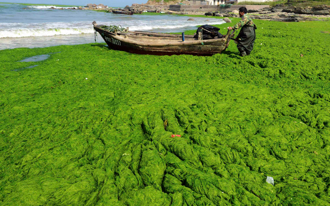 Μοιάζει σαν πίνακας ζωγραφικής όπου ο καλλιτέχνης έχει δώσει μία φουτουριστική πράσινη όψη στην παραλία. Πρόκειται ωστόσο για την ακτή στην επαρχία Shandong της Κίνας, σταανατολικά, όπου ένα παχύ στρώμα άλγης έχει καλύψει το έδαφος.