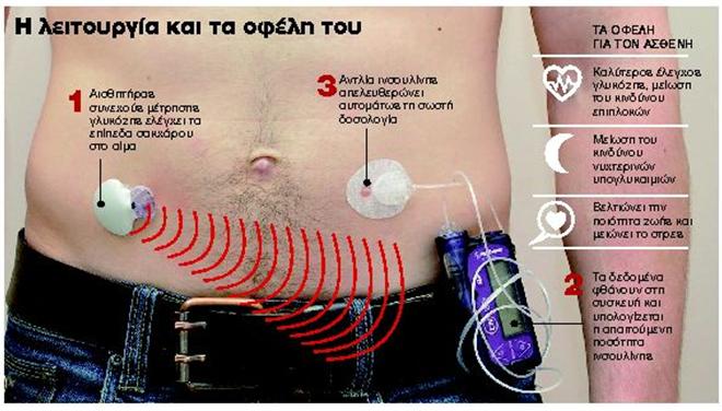 Το σύστημα αποτελείται από μία συσκευή μέτρησης των επιπέδων γλυκόζης (λέγεται και “ζάχαρο” του αίματος) και μία αντλία που τοποθετείται στο σώμα του ασθενούς. Οι δύο συσκευές επικοινωνούν και ανταλλάσσουν δεδομένα μεταξύ τους μέσω υπέρυθρης ακτινοβολίας. Οταν η συσκευή μέτρησης καταλαβαίνει ότι τα επίπεδα σακχάρου στο αίμα είναι αυξημένα, τότε στέλνει σήμα στην αντλία και αυτή με τη σειρά της απελευθερώνει ινσουλίνη.