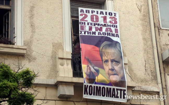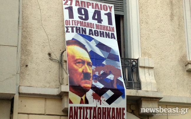 Τα πανό του Δημήτρη Κολλάτου αναφέρουν: «27 Απριλίου 1941 Οι Γερμανοί μπήκαν στην Αθήνα. Αντισταθήκαμε» και «Απρίλιος 2013 Οι Γερμανοί είναι στην Αθήνα. Κοιμόμαστε».