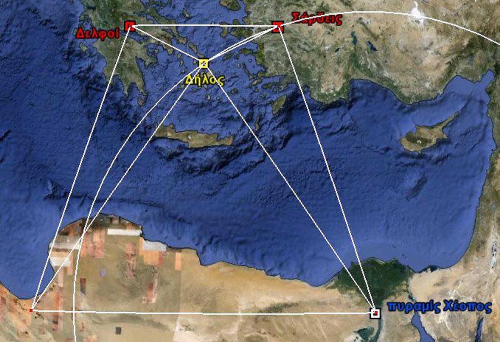 Τα δύο αυτά ισοσκελή τρίγωνα με κοινή κορυφή τη Μεγάλη Πυραμίδα αποδεικνύουν την τριγωνική γαιωδαιτική σύνδεση του αρχαίου ελληνικού χώρου με την Γκίζα. Επίσης έχουν σαν βάση τη χρυσή τομή (Φ-1,6) σε σχέση με τη Δήλο, απ’ όπου καθορίστηκαν οι τοποθεσίες του μαντείου των Δελφών, της Δωδώνης, της Ρόδου και όλων των άλλων σημείων, όπου βρίσκονται 5 από τα 7 θαύματα του Κόσμου. Σάρδεις (Σαρντάνα – Σαρδηνία – Δαναοί), Δελφοί, Σιούα (Σίβα), σχηματίζουν επίσης ισοσκελές τρίγωνο.