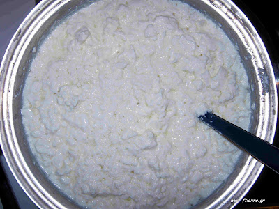 και τον ορρό γάλακτος) σε ένα τρυπητό (σουρωτήρι με μικρές τρύπες) ή