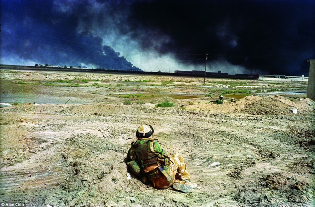 Βασόρα, Απρίλιος 2003. Βρετανοί στρατιώτες βλέπουν τον πυκνό μαύρο καπνό που καλύπτει την πόλη.