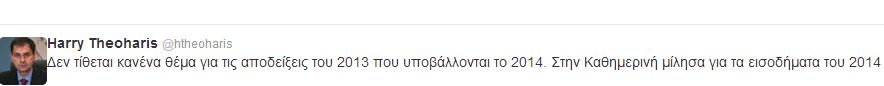 Όπως έγραψε στο twitter ο κ. Θεοχάρης οι φορολογούμενοι φαίνεται ότι δεν θα χρειαστεί να μαζεύουν αποδείξεις το 2014. Ωστόσο κανονικά θα ισχύσουν οι αποδείξεις του 2013 για τις δηλώσεις που θα υποβληθούν μέσα στο 2014. «Δεν τίθεται κανένα θέμα για τις αποδείξεις του 2013 που υποβάλλονται το 2014. Στην Καθημερινή μίλησα για τα εισοδήματα του 2014», ανέφερε.