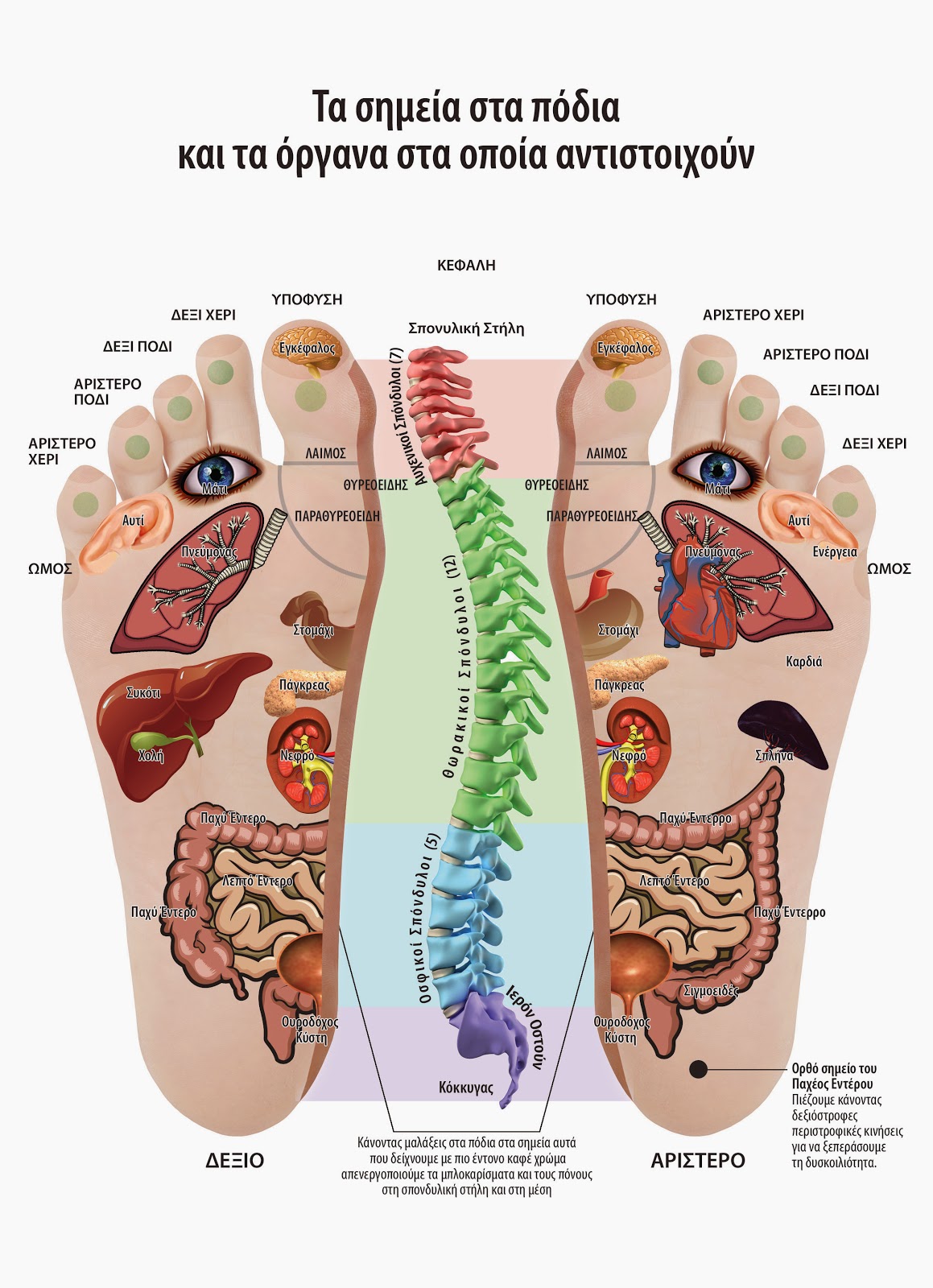 Με το παραπάνω γράφημα μπορούμε να κάνουμε μαλάξεις και να βοηθήσουμε όλα τα οργανά μας και κυρίως να απαλλαγούμε από το θυρεοειδή που βρίσκεται στη βάση του μεγάλου δακτύλου του ποδιού, λεπτομέρειες και οδηγίες υπάρχουν στο βιβλίο μου «Μια Ζωή Γεμάτη Φως»