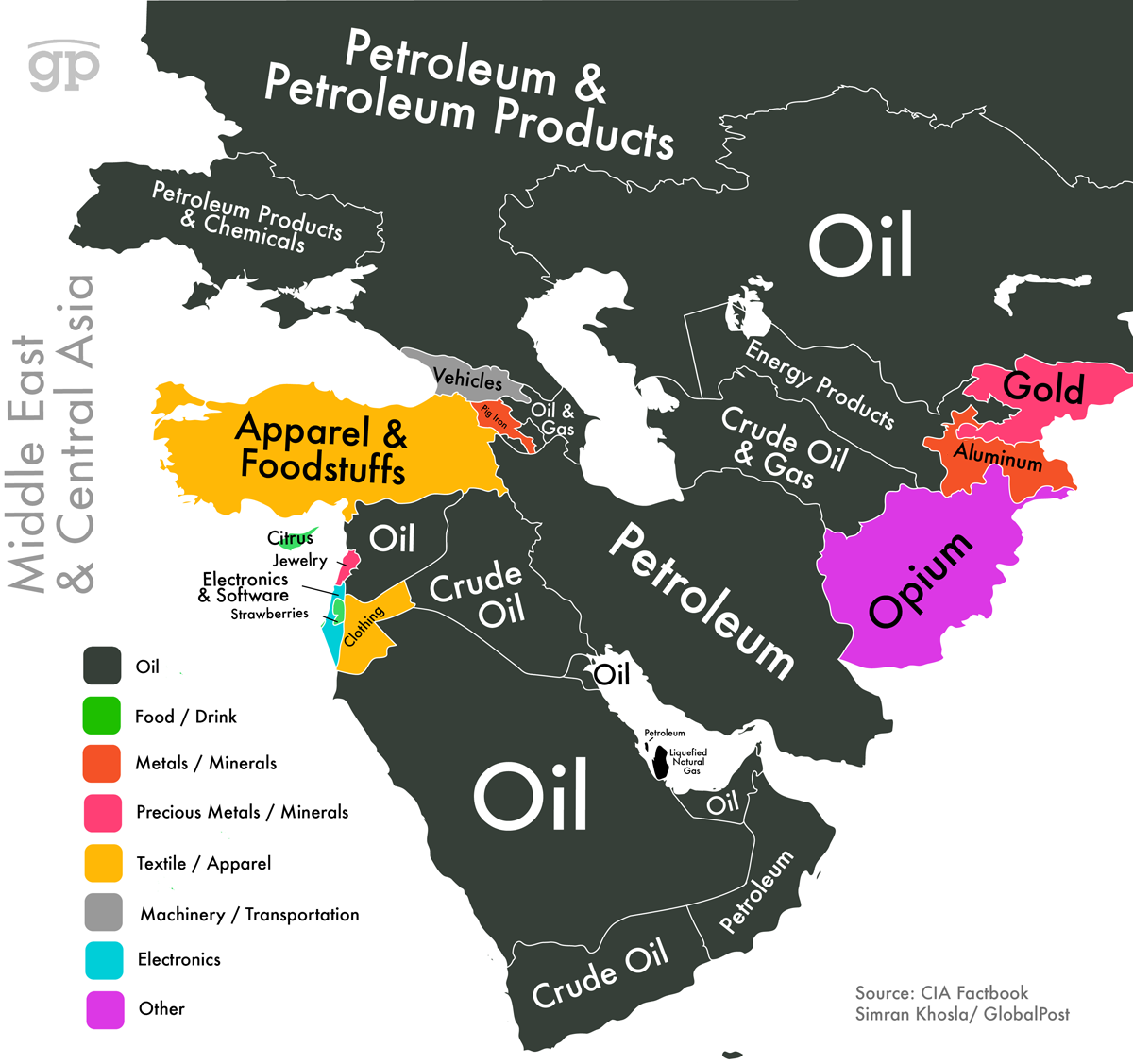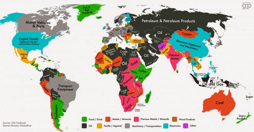 Την κύρια πηγή εσόδων για κάθε χώρα του πλανήτη παρουσιάζει το Globalpost.com, δημιουργώντας έναν παγκόσμιο χάρτη εξαγώγιμων προϊόντων, με στοιχεία από το CIA Factbook, καθιστώντας απλό το να καταλάβει κανείς τις τεράστιες διαφορές που επικρατούν σε κάθε ήπειρο.