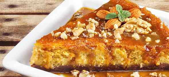 Μετά το αδειάζετε σε στρογγυλό ταψί Νο 40 (δεν το λαδώνετε), το στρώνετε με το χέρι, το κόβετε σε ρόμβους και σε κάθε κομμάτι βάζετε από ένα αμύγδαλο ξεφλουδισμένο. Το ψήνετε στους 180 βαθμούς -πάνω και κάτω αντίσταση- και θα είναι έτοιμο μόνο όταν ξεκολλήσει από το ταψί, μετά από 1-1 ½ ώρα. Το κόβετε ξανά και προσθέτετε το σιρόπι, το οποίο πρέπει να είναι ζεστό.