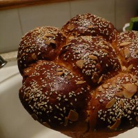 Με ένα πινέλο μαγειρικής το βουτάμε στο χτυπημένο αυγό και το περνάμε στην επιφάνεια των τσουρεκιών, στην συνέχεια τα πασπαλίζουμε με το μαύρο σουσάμι και τα στολίζουμε με τα ασπρισμένα αμύγδαλα.