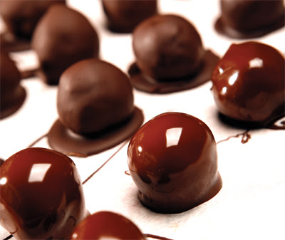 Κρυώνουμε το μείγμα, πλάθουμε σε μπαλάκια 2 εκ. και τα ντύνουμε με χλιαρή κουβερτούρα 54% Hai