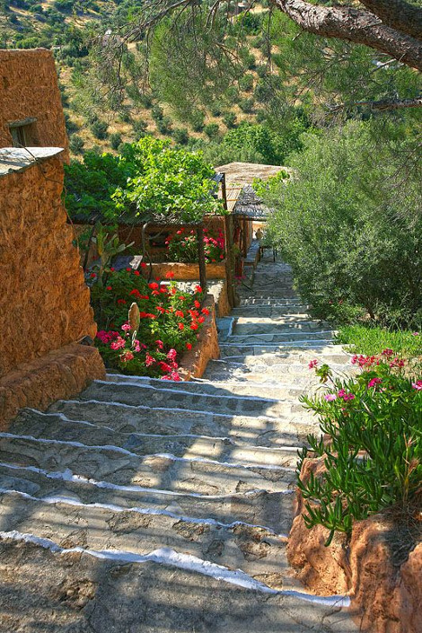 Ενα λιθόστρωτο μονοπάτι γεμάτο κληματαριές, ελιές και λουλούδια ενώνει μεταξύ τους τα 10 σπιτάκια, δίνοντας την αίσθηση στους επισκέπτες ότι μένουν σε ένα παραδοσιακό χωριό της νοτιοανατολικής Κρήτης.