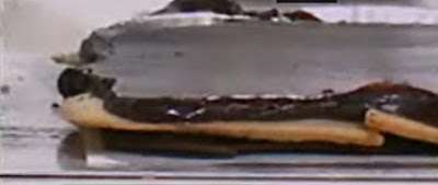 Στο ένα φύλλο της βάσης απλώνουμε τη μαρμελάδα. Τοποθετούμε πάνω απ' αυτή το άλλο φύλλο της βάσης, την κρέμα σοκολάτα και το τρίτο φύλλο της βάσης. Κόβουμε τετράγωνα κομμάτια και κάθε κομμάτι το κόβουμε διαγωνίως ώστε να έχουμε 2 τρίγωνα. Τα πιάνουμε με μία οδοντογλυφίδα.