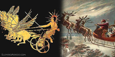 Φυσικά μεγάλη εντύπωση προκαλεί και το μυθολογικό γεγονός του "Αγιοβασίλη" με το έλκηθρο του που το κινούν οι ιπτάμενοι τάρανδοι. Ούτε αυτό όπως καταλαβαίνετε, δεν θα μπορούσε να μην παρθεί απο την Αρχαία Ελλάδα. Όπως αναφέραμε πιο πρίν , τον μήνα Δεκέμβριο, οι Έλληνες γιόρταζαν τον Διόνυσο αλλά και τον Φωτοφόρο Απόλλωνα-Ηλίου παριστάνοντας τον πάνω στο ιπτάμενο άρμα του, να μοιράζει το φως. Το άρμα έγινε έλκηθρο, τα άλογα έγιναν τάρανδοι και το "δώρο" του φωτός που μοίραζε στους ανθρώπους ...έγινε κυριολεκτικά "μοίρασμα δώρων".
