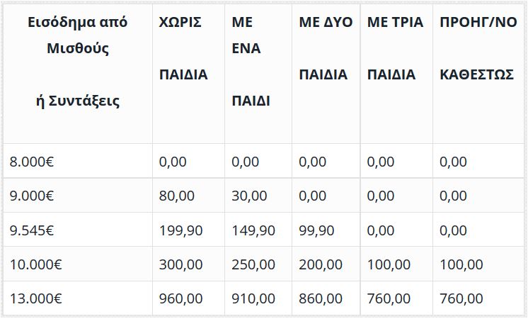 Ο φόρος που προκύπτει από τη παραπάνω κλίμακα μειώνεται κατά το ποσό των χιλίων εννιακοσίων (1.900) ευρώ για το φορολογούμενο χωρίς εξαρτώμενα τέκνα,, όταν το φορολογητέο εισόδημα από μισθωτές υπηρεσίες και συντάξεις δεν υπερβαίνει το ποσό των είκοσι χιλιάδων (20.000) ευρώ.